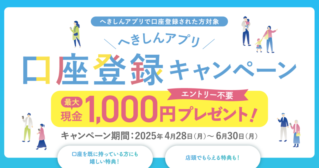 なんと、新しくへきしんで口座を作った人の中から先着2,500名に、最大1,000円の現金がプレゼントされるんです!